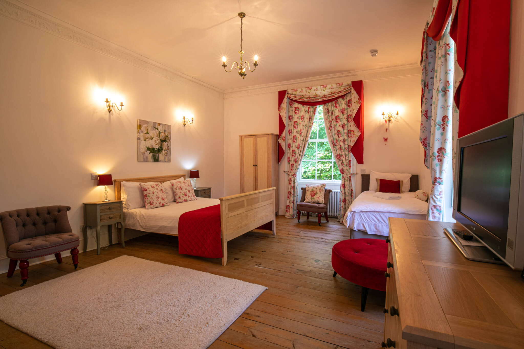 A larger room with one double bed and one single. It has a private bathroom with a bath.